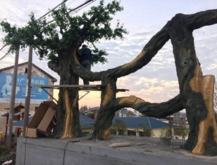 安徽合肥廬江縣宋家小院榕樹(shù),榕樹(shù)尺寸高3米直徑80cm蓬徑4.5米。工期5天。內(nèi)部采用鋼骨架結(jié)構(gòu)外部采用水泥直塑工藝。樹(shù)葉普通榕樹(shù)葉。
