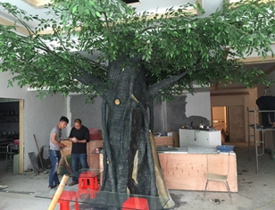 安徽合肥廬江縣宋家小院榕樹,榕樹尺寸高3米直徑80cm蓬徑4.5米。工期5天。內(nèi)部采用鋼骨架結(jié)構(gòu)外部采用水泥直塑工藝。樹葉普通榕樹葉。