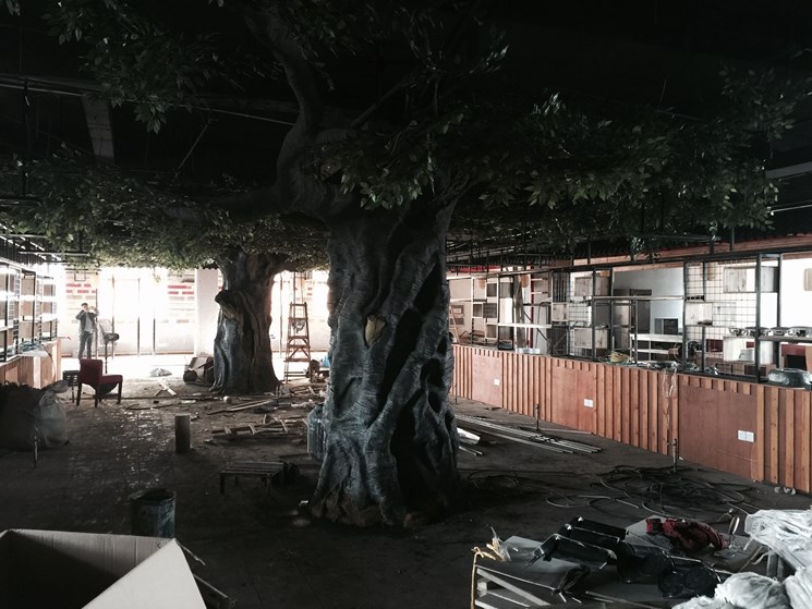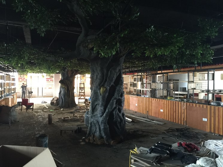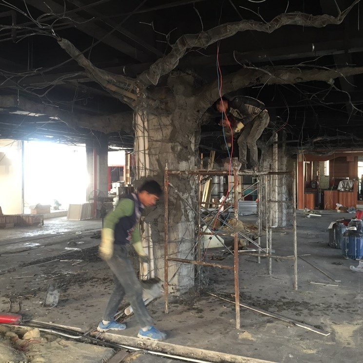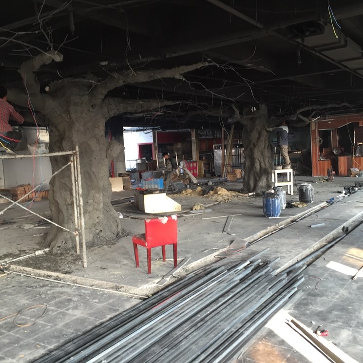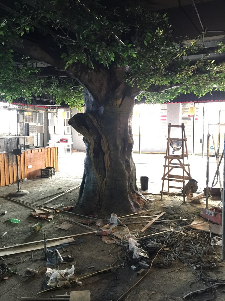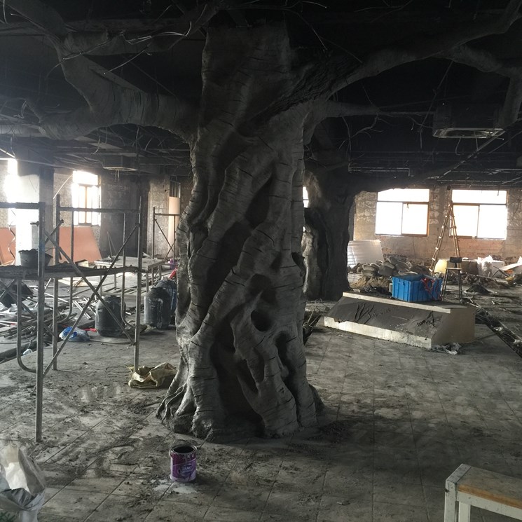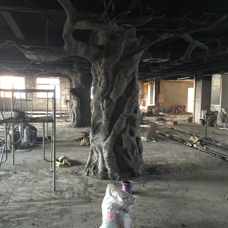 揚州仿真樹--本項目建設是一家知名連鎖機構叫魚頭火鍋店。內部中間有三個水泥柱子影響美觀,景觀與業(yè)主再三溝通最后做了三顆仿真樹。樹直徑1.1米高3.8米,樹枝伸展直徑6米。整體工期15天。本項目樹枝沒有采用真樹枝嫁接方式,直接采用水泥一次性焊接而成的。