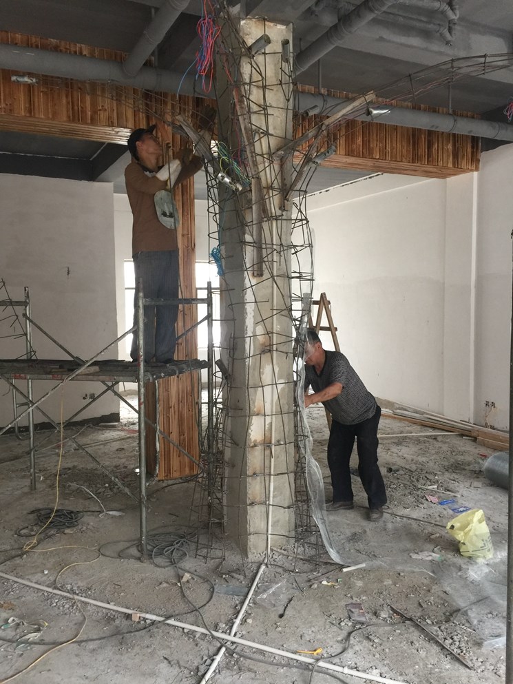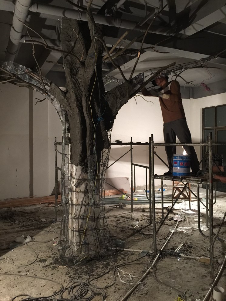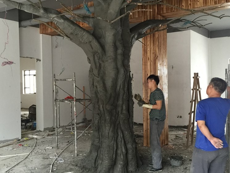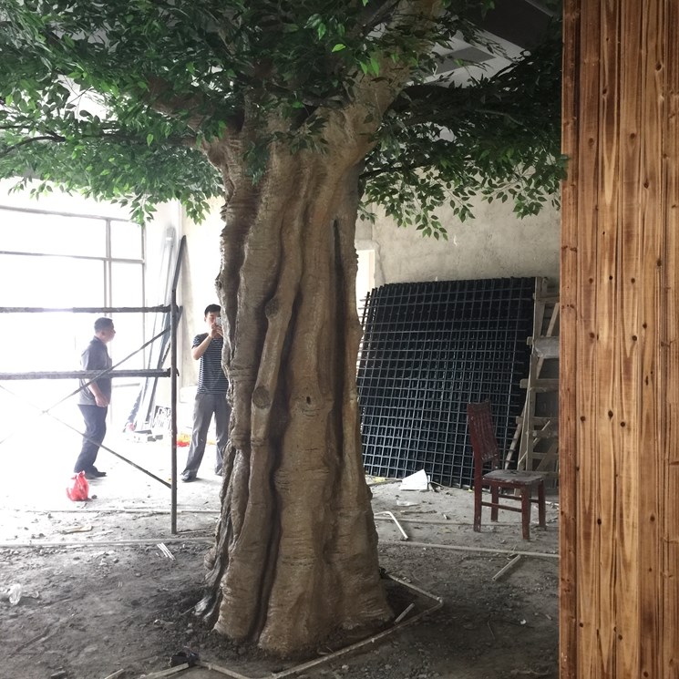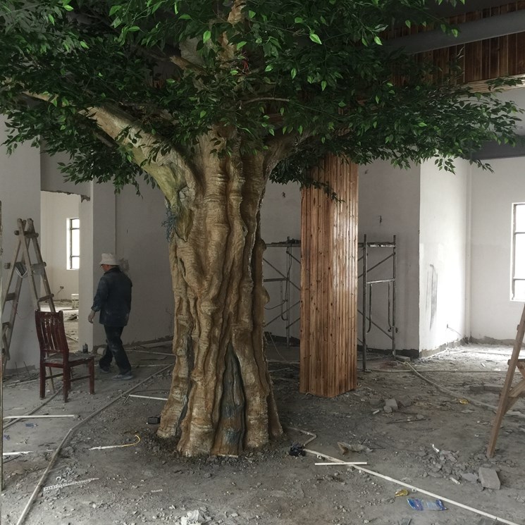 安徽仿真樹之九華山佛緣書畫中心,本項目采用鋼骨架結(jié)構把中心柱包裹起來即遮蓋不美觀主題又增加一個經(jīng)典。樹高度3.5米。直徑80cm工期6天。采用真樹枝嫁接工藝。整個仿真榕樹是這個館里焦點。