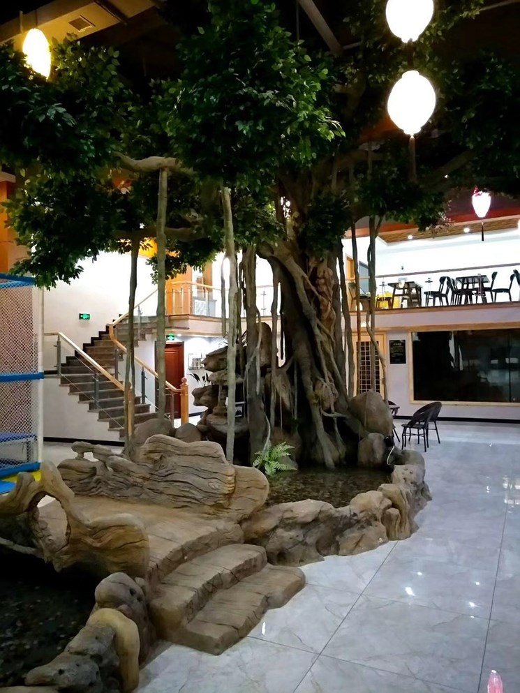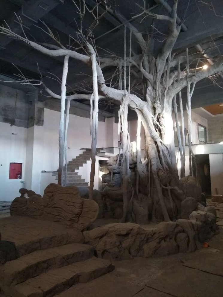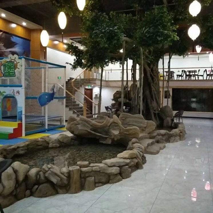 南京室內(nèi)仿真樹塑石假山駁岸景石結(jié)合景觀,全部采用水泥材質(zhì)人工雕刻手法表現(xiàn)。本項(xiàng)目仿真榕樹尺寸高4米直徑60cm寄生根非常流暢。使整體環(huán)境得到充分結(jié)合。仿木小橋也非常融入整體環(huán)境。