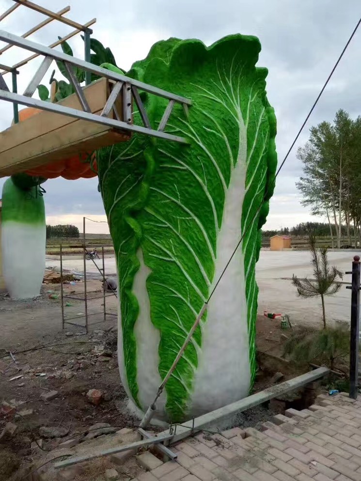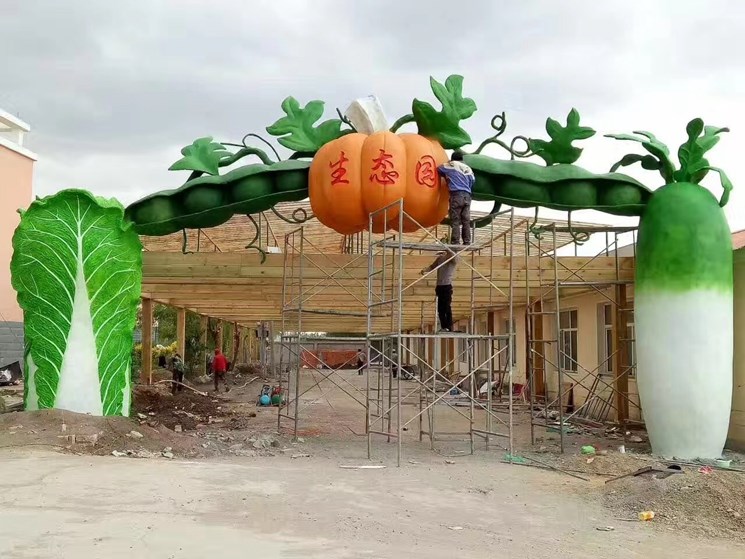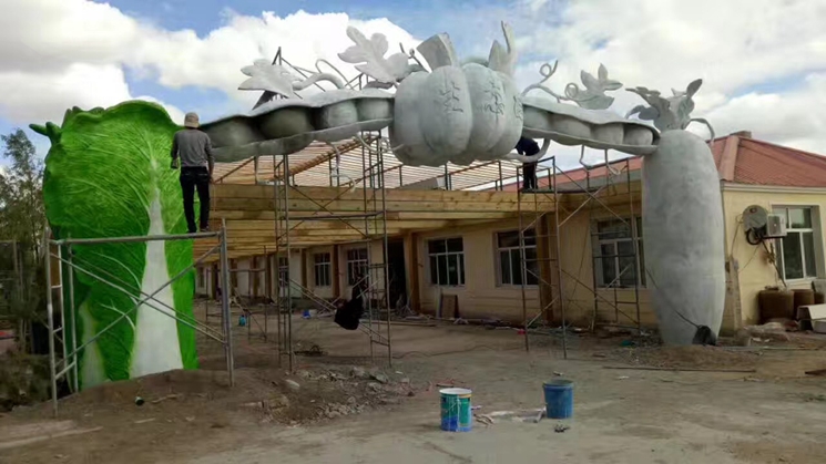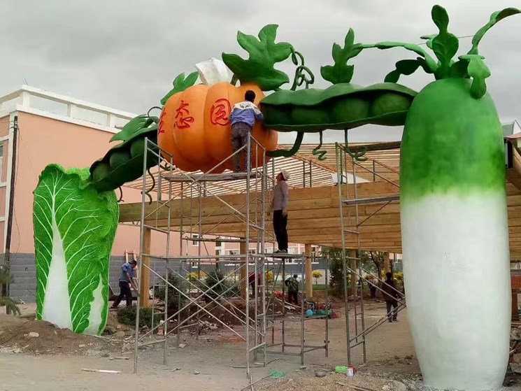 本項(xiàng)目是農(nóng)業(yè)生態(tài)園,利用本地特色盛產(chǎn)大白菜與南瓜作為代表,他們結(jié)合組成一個(gè)特色的蔬菜大門。采用材質(zhì)也是水泥,水泥雕塑經(jīng)過師傅精細(xì)處理在經(jīng)過彩繪師調(diào)色最終呈現(xiàn)在眼前是一個(gè)連行業(yè)內(nèi)的專業(yè)人士都贊不絕口。