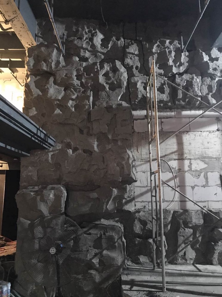 浙江臺州萬達室內(nèi)仿真景觀-仿木欄桿-塑石背景墻。由于萬達廣場對防火措施要求特別嚴格,所有欄桿都采用水泥仿木欄桿,效果逼真還防火。欄桿總長度45米,塑石假山背景墻總面積30平方米。施工工期25天。