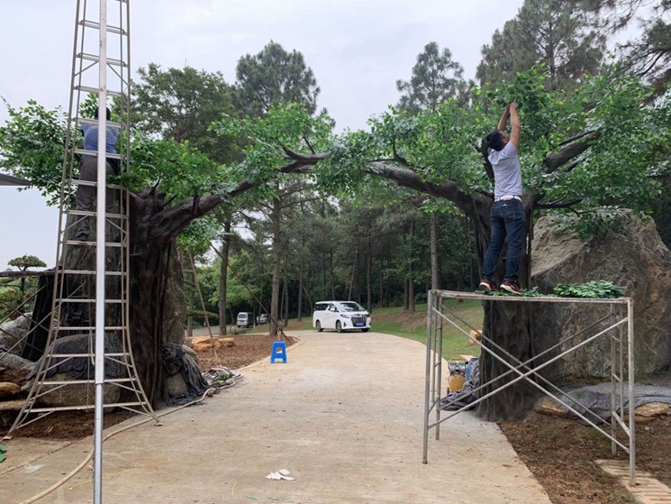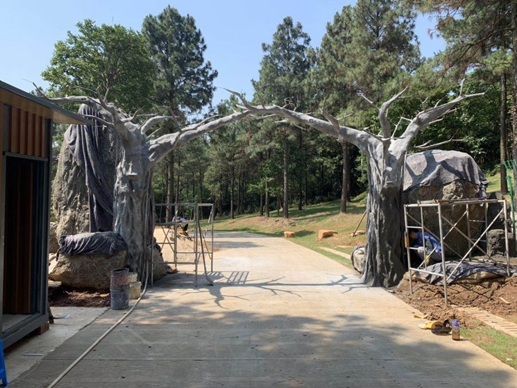 南京高淳大山國際慢城水泥仿真假樹大門,這是一個(gè)南京慢城內(nèi)部一個(gè)小景區(qū)大門,高度4.3米利用兩棵假樹樹枝搭接形成一個(gè)假樹大門,配上山東泰山石組合真山假樹搭配。也是此景區(qū)的一個(gè)景點(diǎn)。工期12天。樹葉配置800枝。顏色是甲方指定墨綠黑顏色。