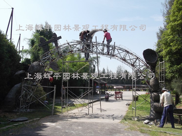 本項(xiàng)目建設(shè)在臺(tái)州玉環(huán)漩門(mén)灣嘻哈農(nóng)園,卡通藝術(shù)門(mén)頭采用材質(zhì)水泥手工雕刻,內(nèi)部采用鋼骨架結(jié)構(gòu),這樣在室外大大加大他使用壽命。整體效果具有濃濃的兒童樂(lè)園的氣息。工期25天。得到業(yè)主高度評(píng)價(jià)。